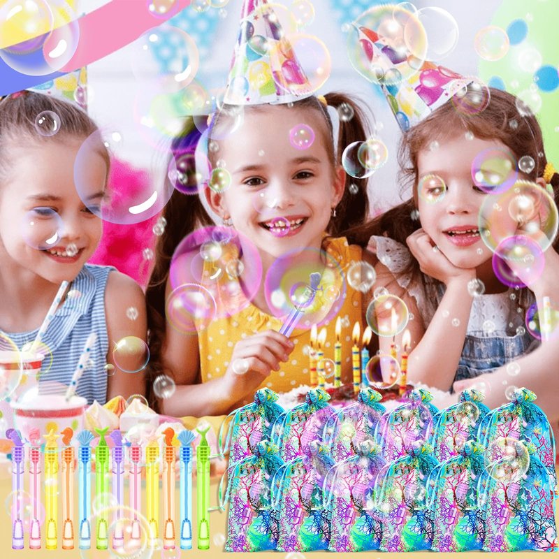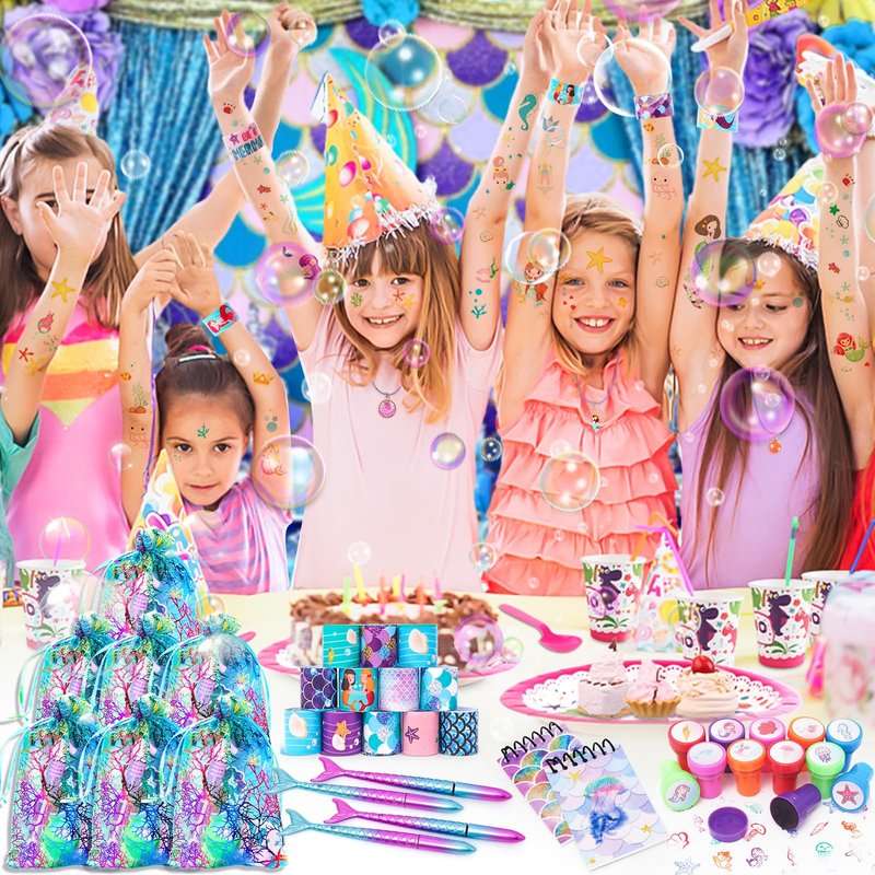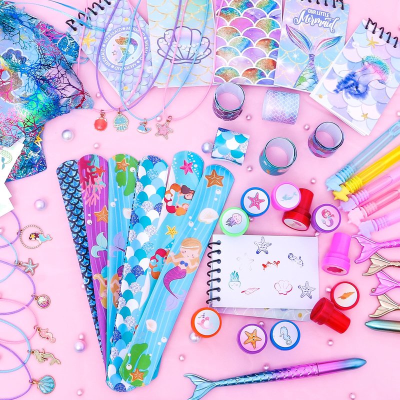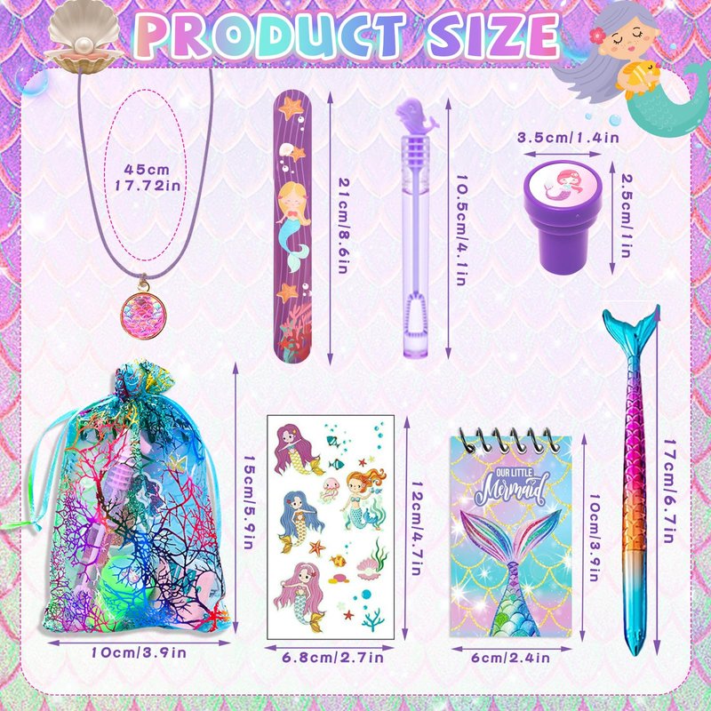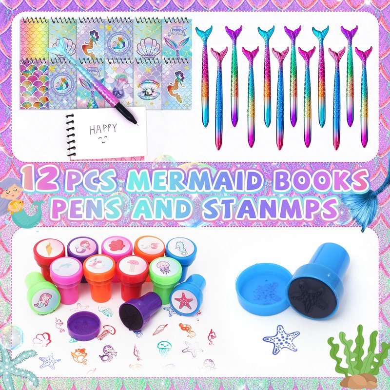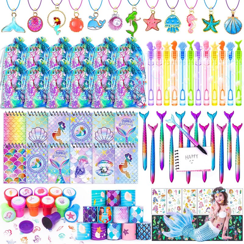 - MERMAID PARTY FAVORS INCLUDED : 12 Mermaid Goodie Bags, 12 Mermaid Necklaces, 12 Sea Creature Stamps, 12 Mini Note Books, 12 Mermaid Tail Pens, 12 Mermaid Temporary Tattoos, 12 Mini Bubble Wands, and 12 Slap Bracelets. Plenty of sea toys to keep the kids entertained at the party.