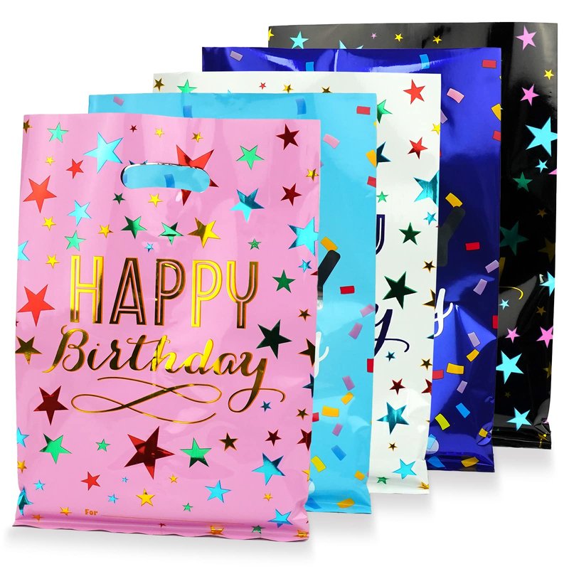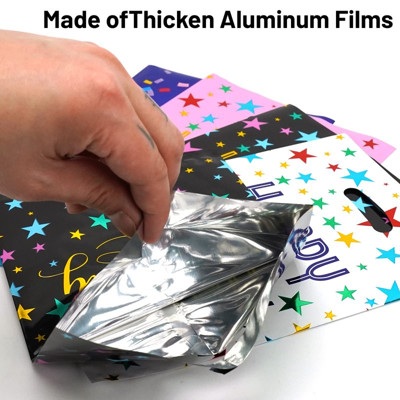 - đăHigh Quality MaterialsăPerfect for party return favors, this birthday party treat bags are designed with thick aluminum foil and has handles for easy portability.