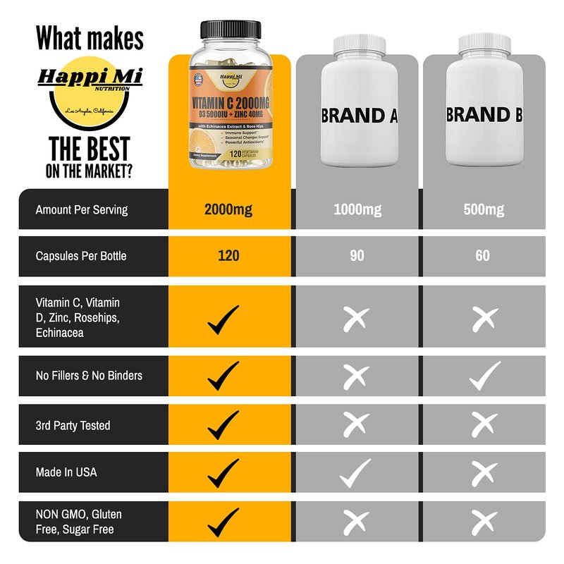 - Suplemento de apoyo inmunológico: La vitamina C de Happi Mi Nutrition tiene 2000 mg de ácido ascórbico, 40 mg de zinc, 125 mcg de vitamina D3, 30 mg de Echinacea purpurea y 30 mg de rosehips por 60 dias. la vitamina c es buena para mejorar el sistema inmunológico de los adultos y de los niños, apoyar las articulaciones y la piel y la salud cardiovascular. Por lo general, se toma con vitamina d3, zinc, vitamina A, vitamina E, extracto de equinácea y rosehips para obtener mejores resultados.