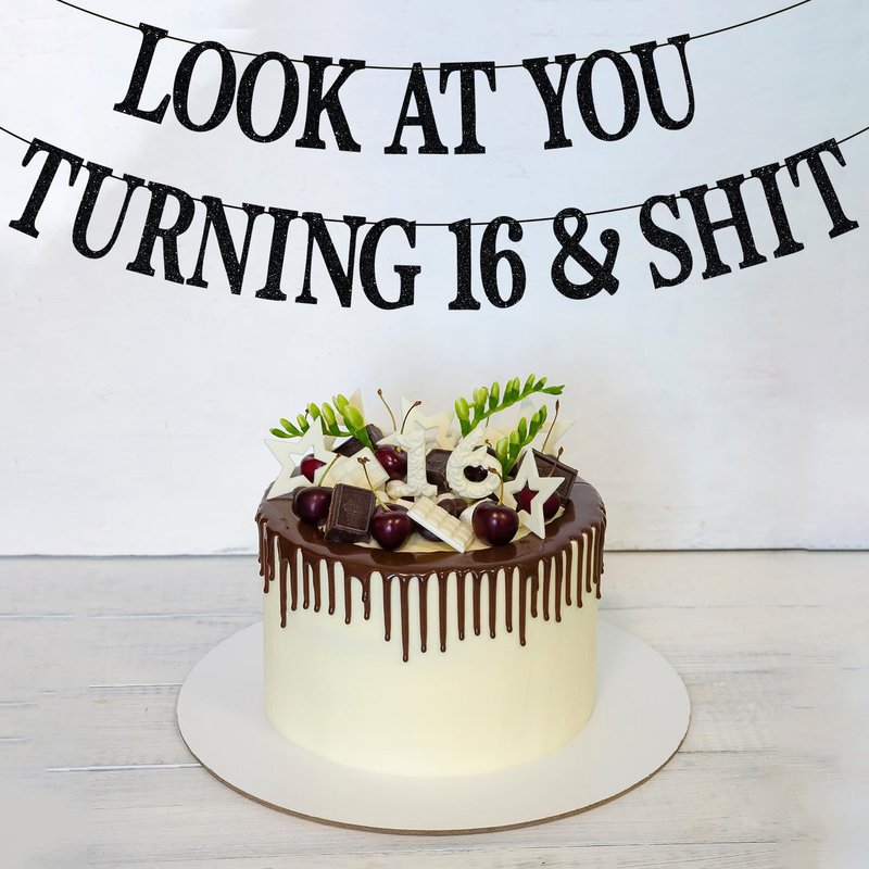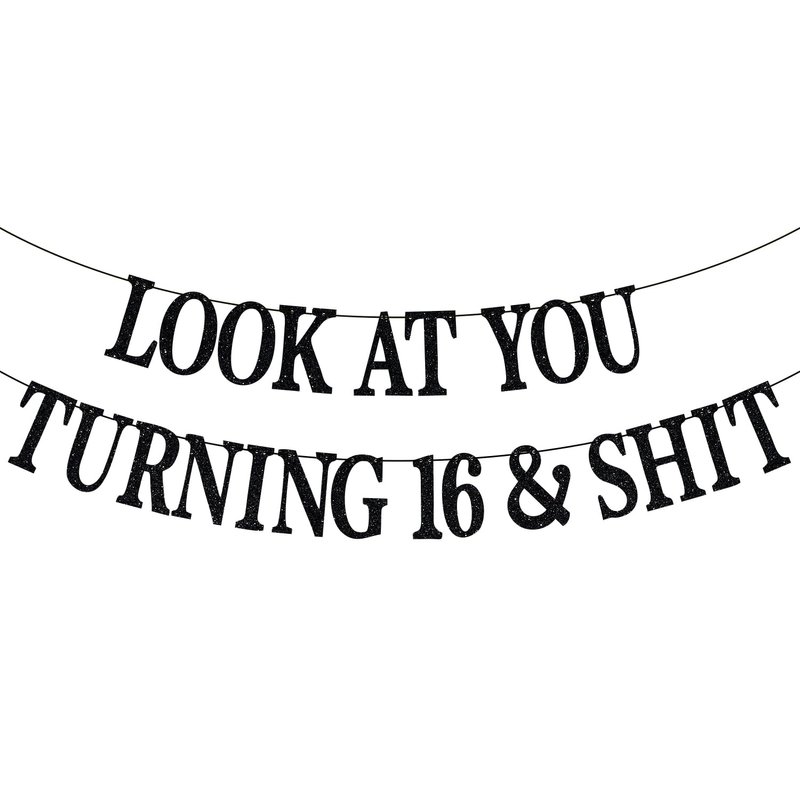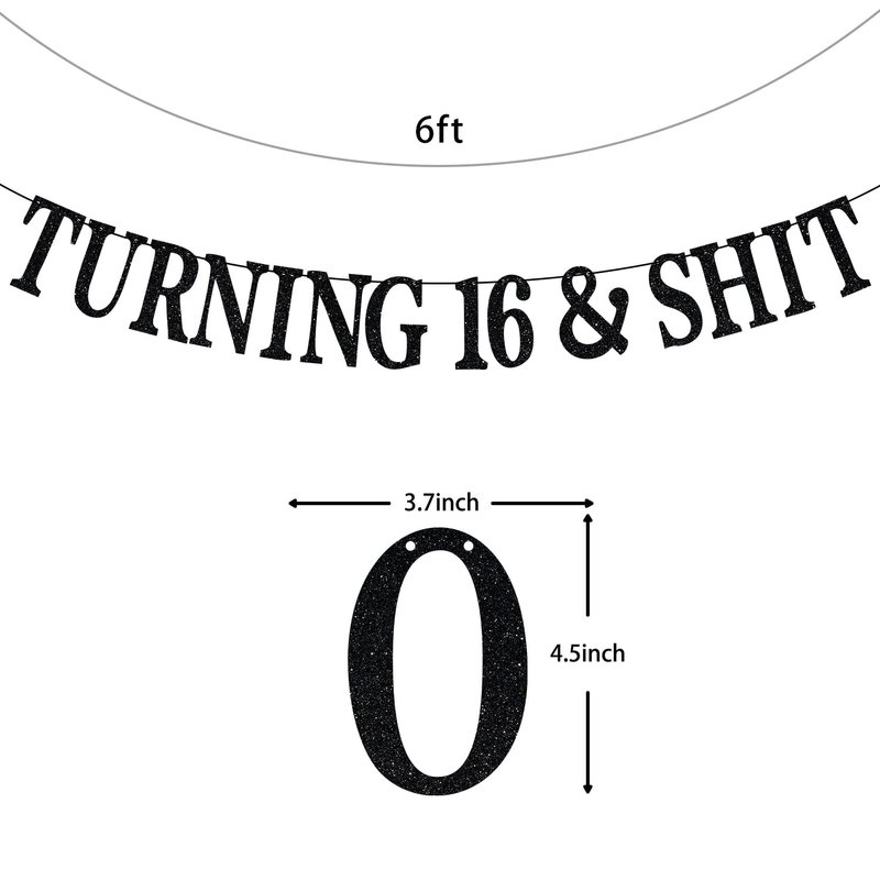 Happy 16th Birthday Banner, Happy Sweet 16, 16 and Fabulous, Funny Teens 16th Birthday Party Decorations Backdrop Gifts, Black Glitter
