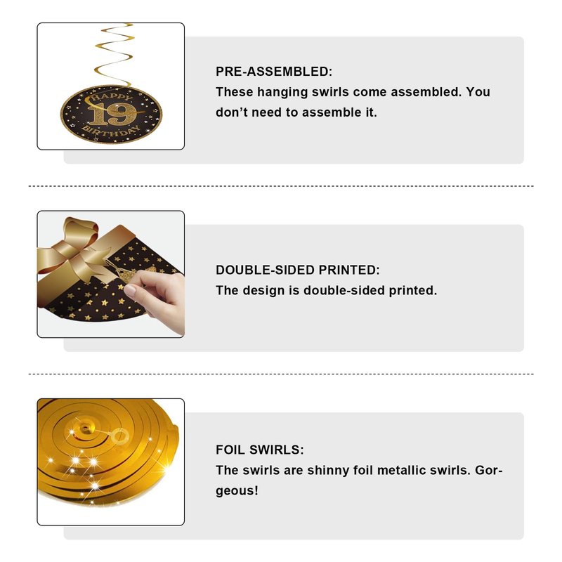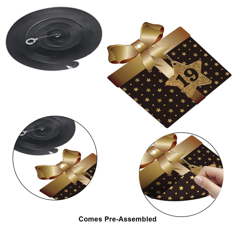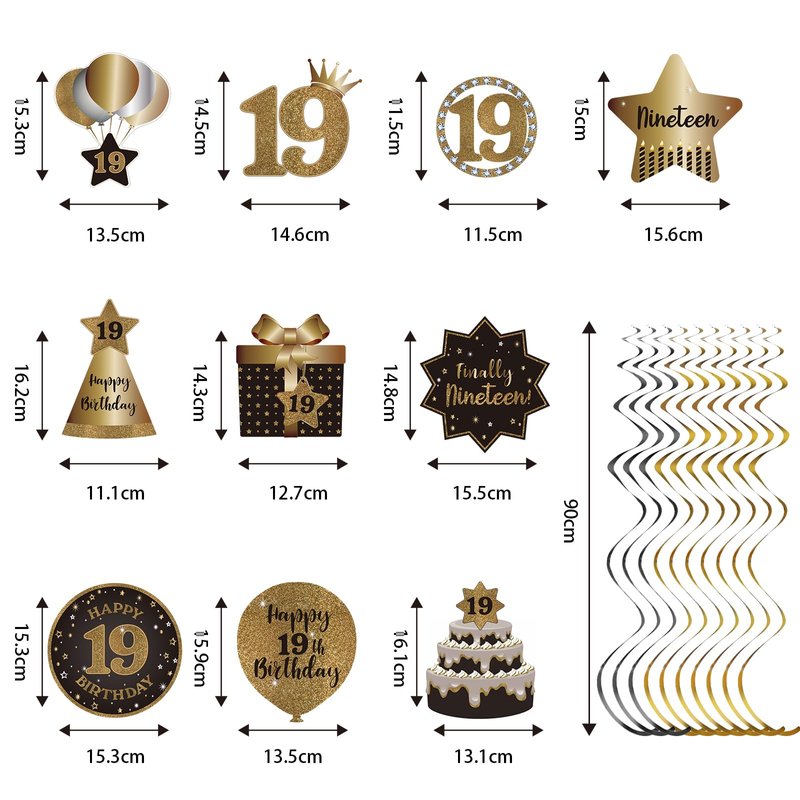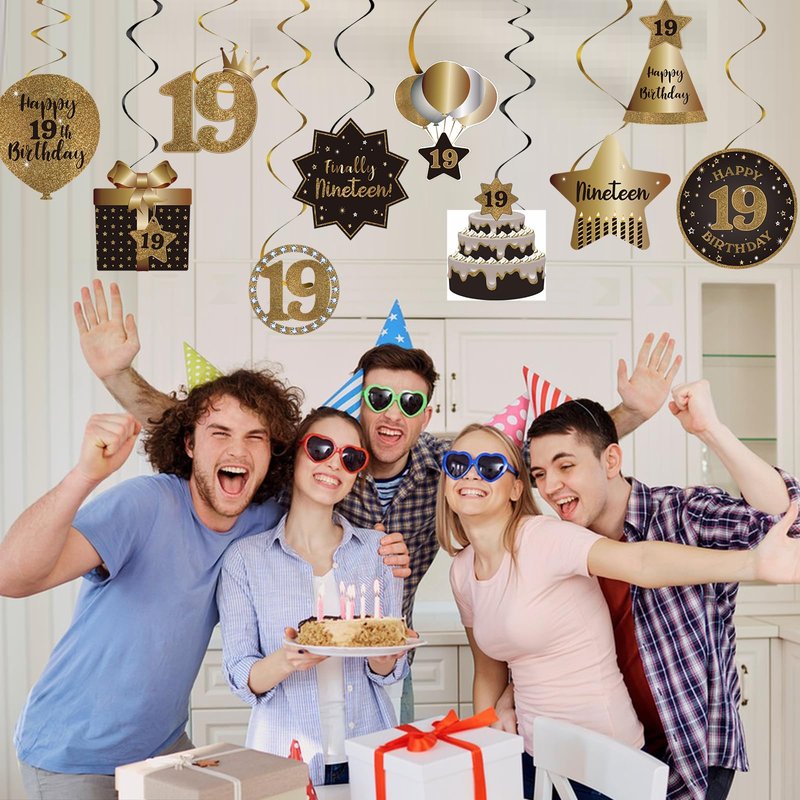 - 19th Birthday Decoration Kit: Comes with total 10 different hanging swirls in the kit. The cutouts are double-sided design in black glitter color. The swirls are shiny metallic foil swirls. There are a variety of birthday element patterns including gift box, hat, cake and other popular patterns…