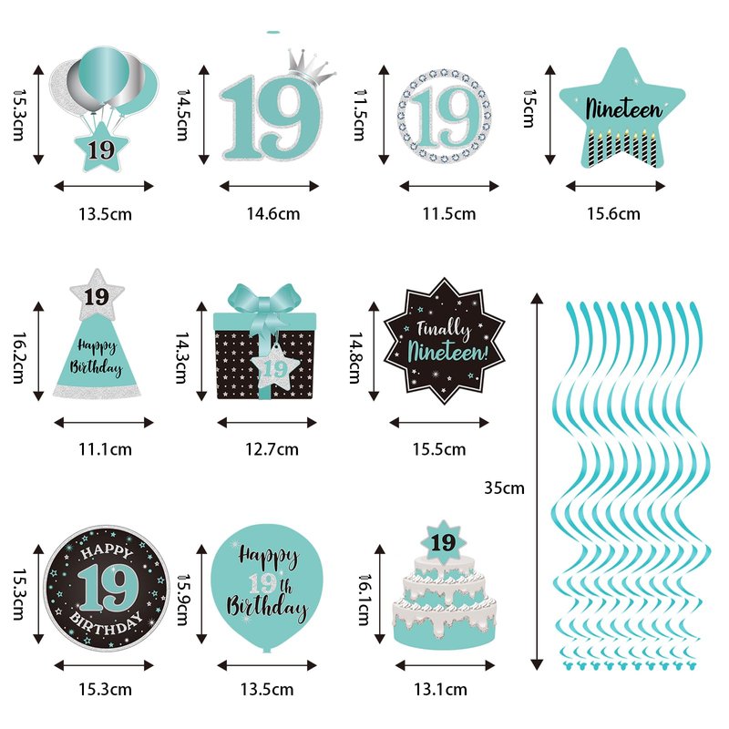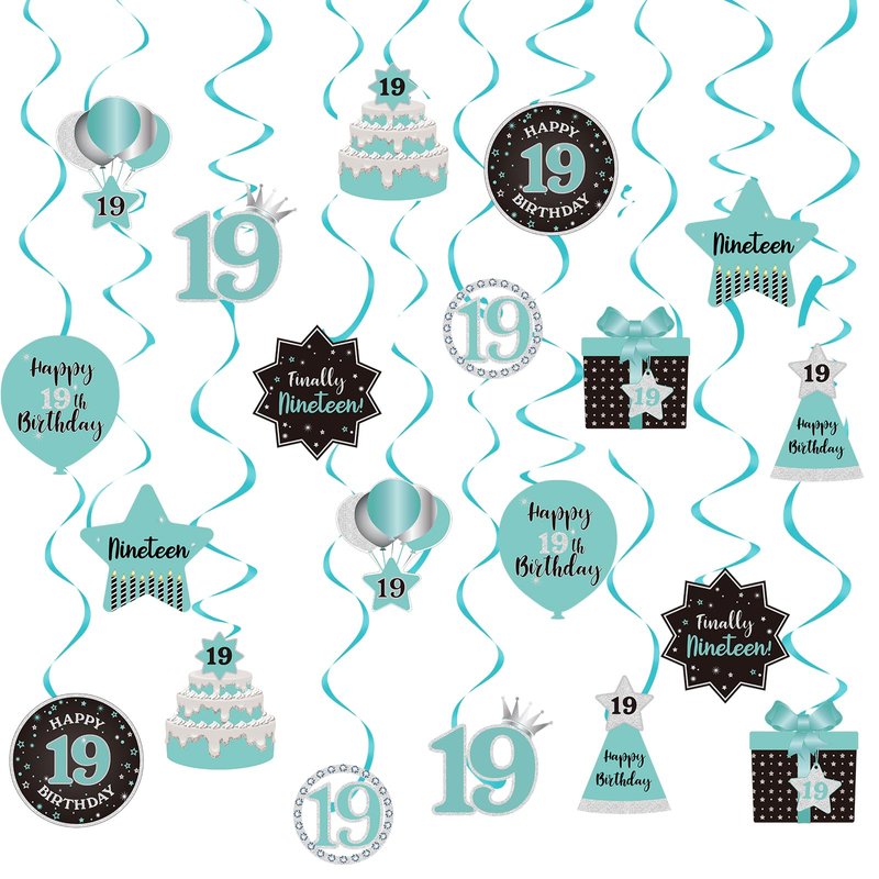 - 19th Birthday Decoration Kit: Comes with total 20 different hanging swirls in the kit. The cutouts are double-sided design in teal silver black blue color. The swirls are shiny metallic foil swirls. There are a variety of birthday element patterns including gift box, hat, cake and other popular patterns.