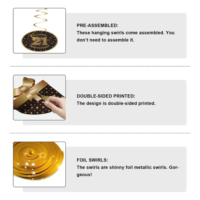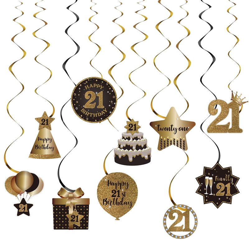 - 21st Birthday Decoration Kit: Comes with total 10 different hanging swirls in the kit. The cutouts are double-sided design in black and glitter gold color. The swirls are shiny metallic foil swirls. There are a variety of birthday element patterns including gift box, hat, cake and other popular patterns…