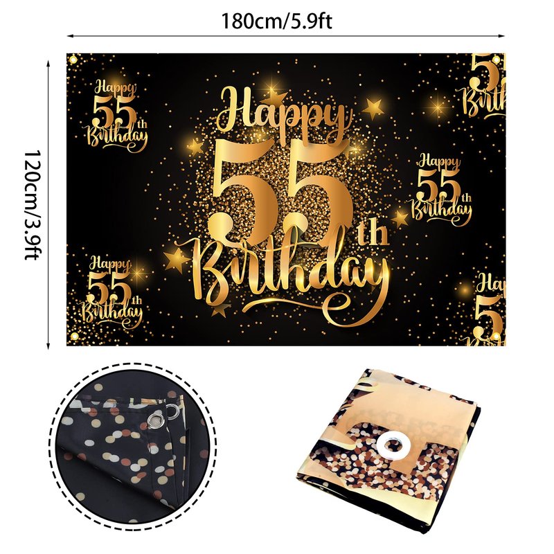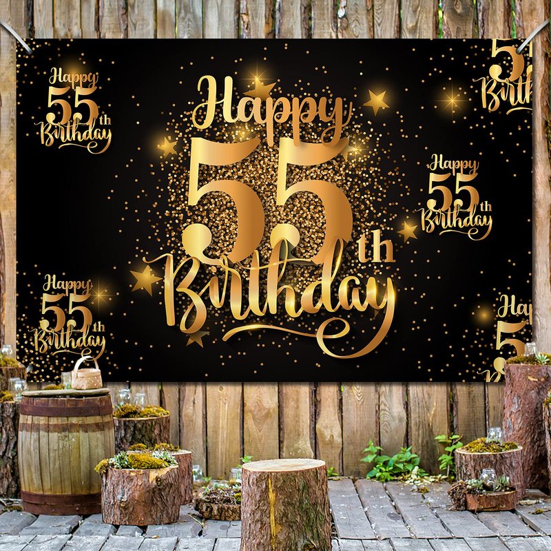 Happy 55th Birthday Backdrop Banner Step and Repeat 55 Years Old Background Decorations for Women Men Her Him Photography Party Supplies Glitter Black Gold