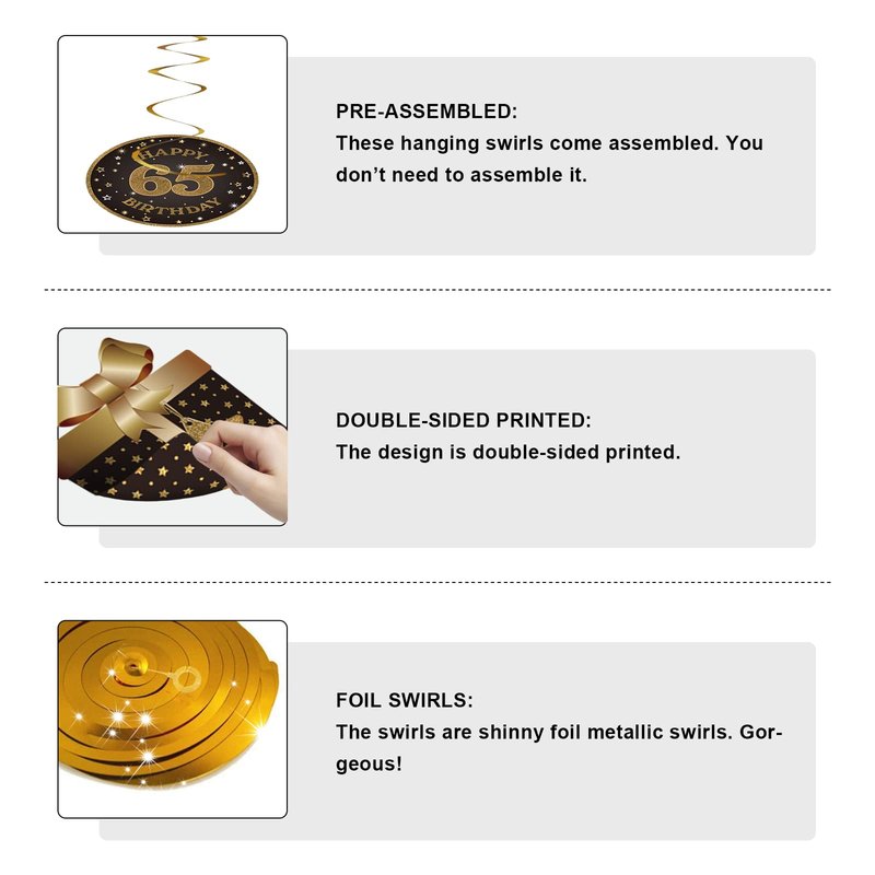 - 65th Birthday Decoration Kit: Comes with total 10 different hanging swirls in the kit. The cutouts are double-sided design in black and glitter gold color. The swirls are shiny metallic foil swirls. There are a variety of birthday element patterns including gift box, hat, cake and other popular patterns…