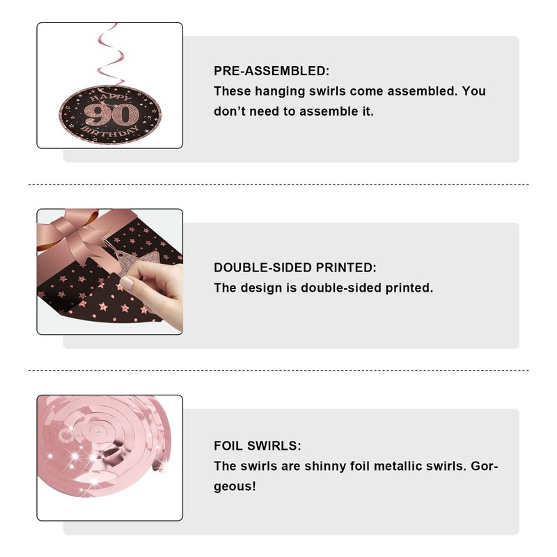 - 90th Birthday Decoration Kit: Comes with total 10 different hanging swirls in the kit. The cutouts are double-sided design in rose gold and glitter gold color. The swirls are shiny metallic foil swirls. There are a variety of birthday element patterns including gift box, hat, cake and other popular patterns…