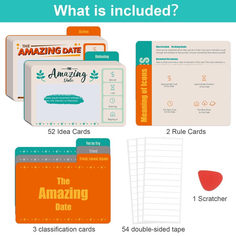 - THE PRODUCT INCLUDES: 52 scratch-off date cards, 3 category dividers, 1 rule card, 1 icon guide card, 2 mode dividers, 1 scratcher, and 54 double-sided adhesive strips—everything you need, no additional purchases required. The top-and-bottom box design allows for easy access to the cards, and the dividers help keep everything neatly organized.