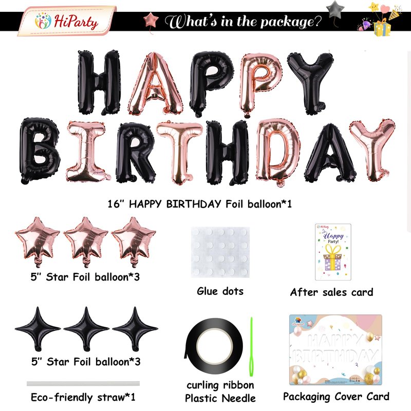 - 🍰【What will you Get】①Happy Birthday letters x13pcs(16in) ②Four-pointed star x3pcs (10in) ③five-pointed star x3pcs (10in) ④Ribbon x1pcs (33ft) ⑤Plastic straw x1pcs(4.65 in) ⑥Double-sided glue dot (20dot) ⑦HiParty Customer Service Card ⑧1pcs needle.