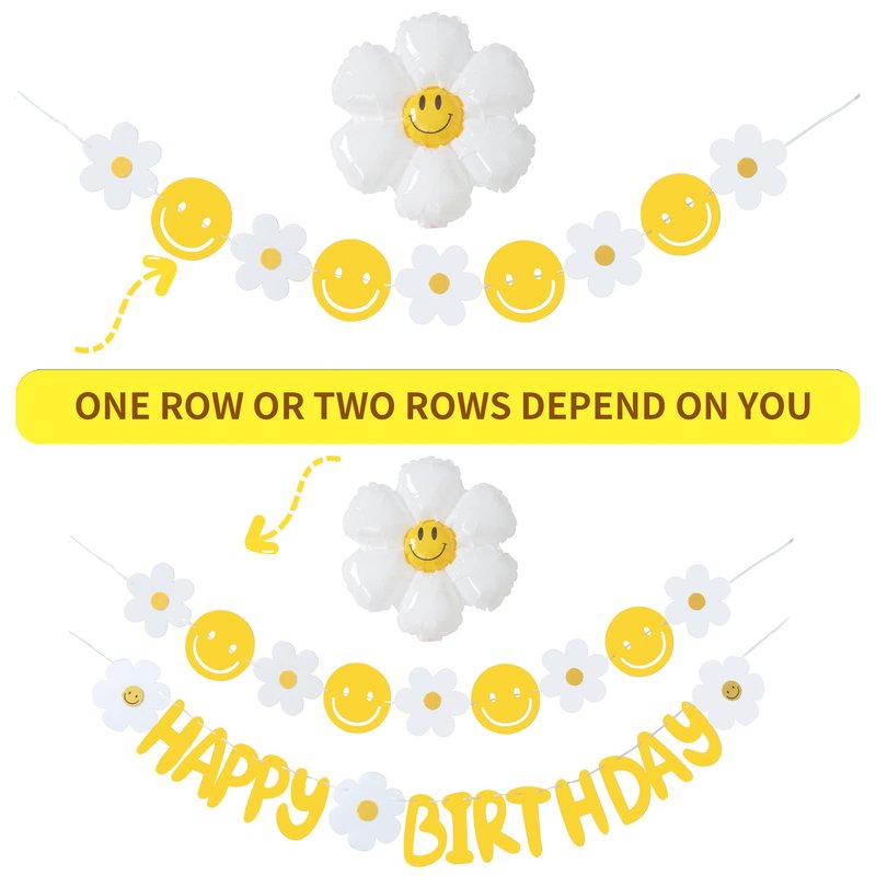 - PACKAGE INCLUDES: You will receive a package with 13 pcs of felt flags that can spell the phrase "HAPPY BIRTHDAY", (Note that the same letters may overlap), 5 pcs of felt cards of daisies, 1 pcs of daisy flower balloon, 4 pcs of felt cards of the smiley face, 2 pcs of ropes and 2 pcs of small sticks