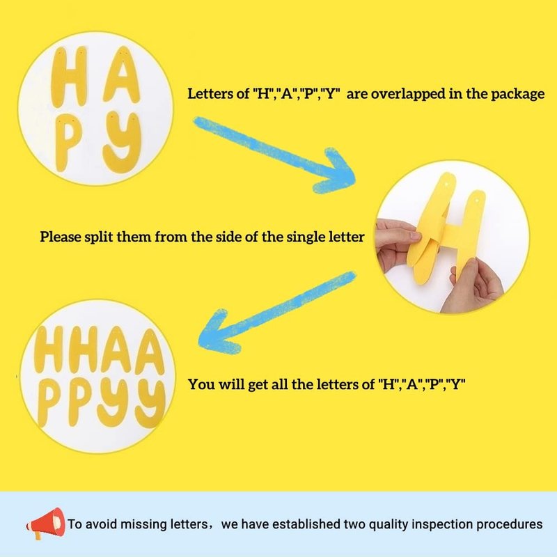 - 💗Letters of "H", "P", " A", "Y" are overlapped in the package, which makes two same letters looks like only one letter. Please split them from the side of single letter. You will get all letters to spell HAPPY BIRTHDAY