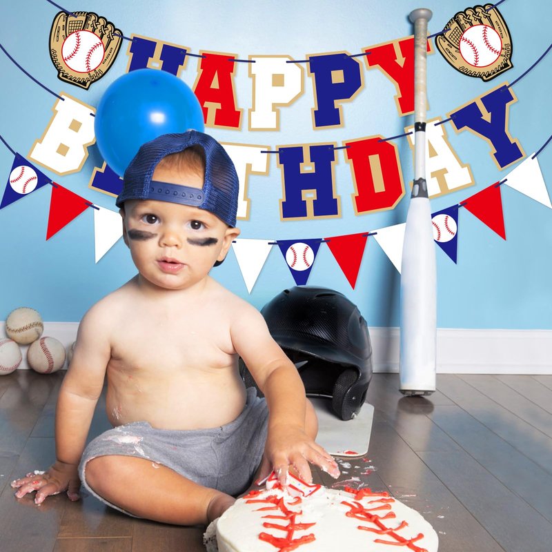 Happy Birthday Banner for Baseball Birthday Decorations, Sports Theme Birthday Party Supplies, Baseball Pennant Bunting Party Supplies for Boys (Red White and Blue)
