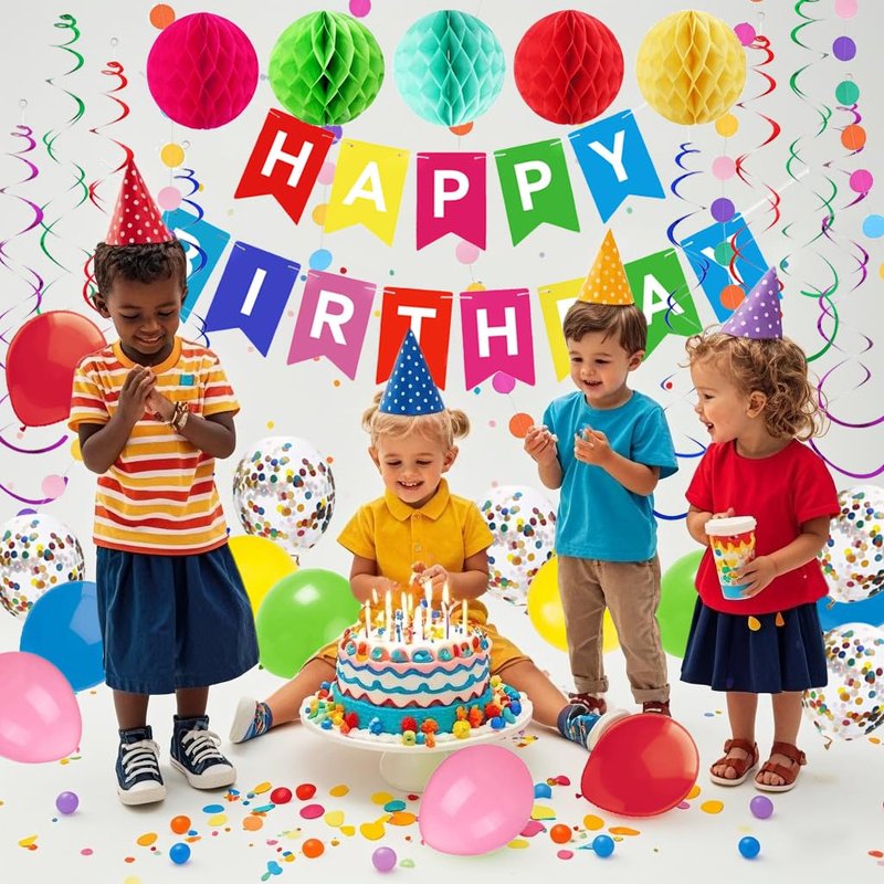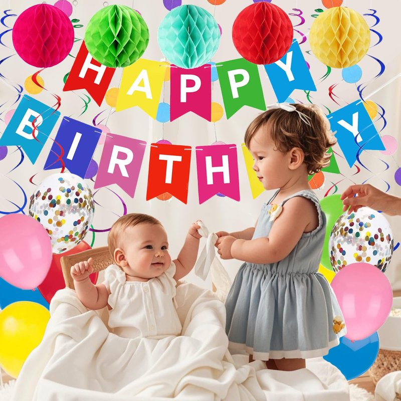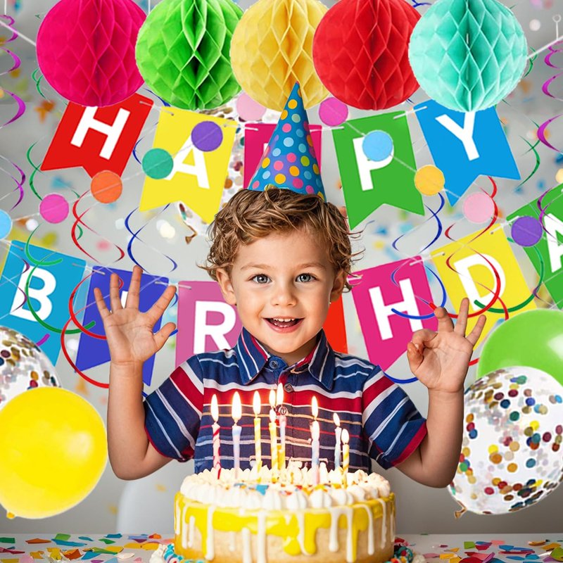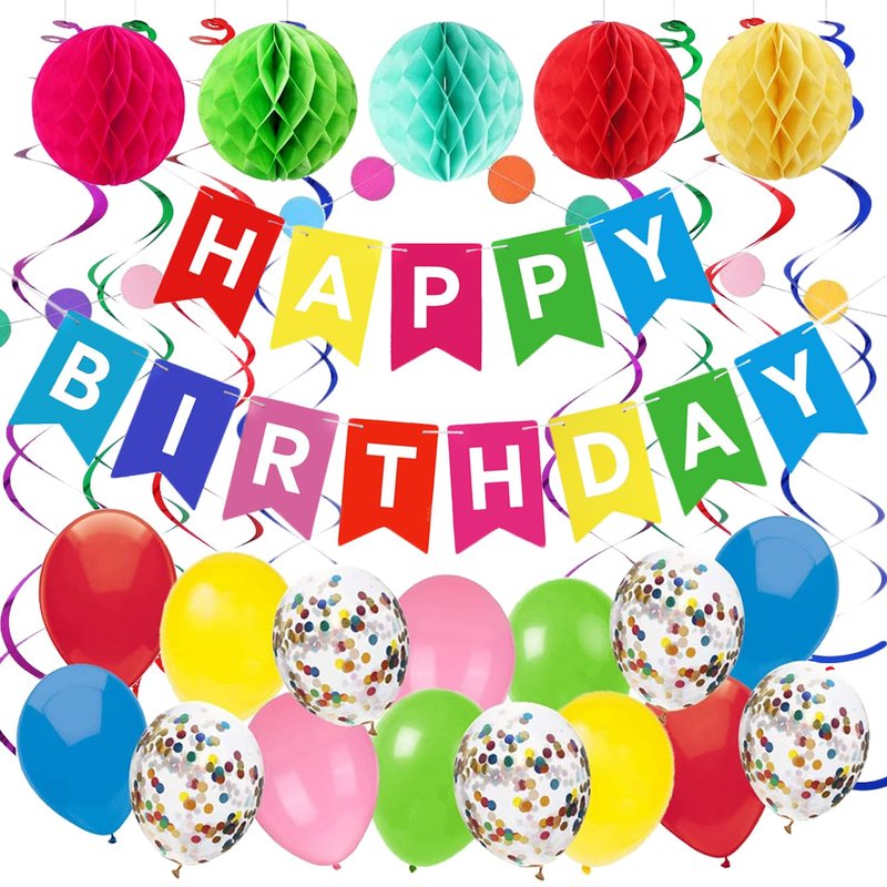 - Happy Birthday Decorations Set Includes: 1 happy birthday banner, 5 paper poms honeycomb balls, 1 circle dots hanging decoration, 8 hanging swirl streamers, 5 confetti balloons,10 colorful balloons. Rich combinations are enough to meet your party needs