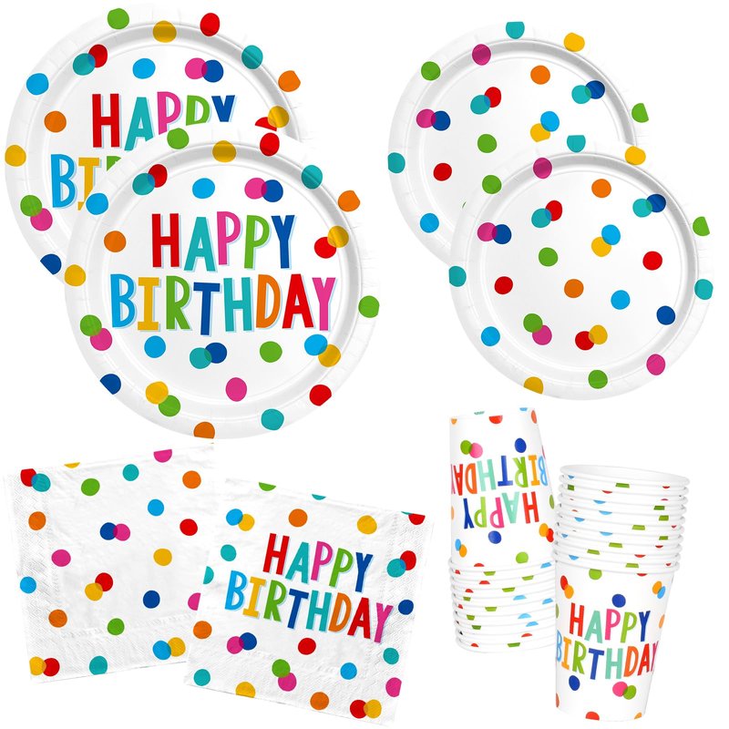 Happy Birthday Decorations: Kids' Birthday Party Supplies with Dots Design - Includes Happy Birthday Plates and Napkins, Disposable Paper Cups, Serves 16