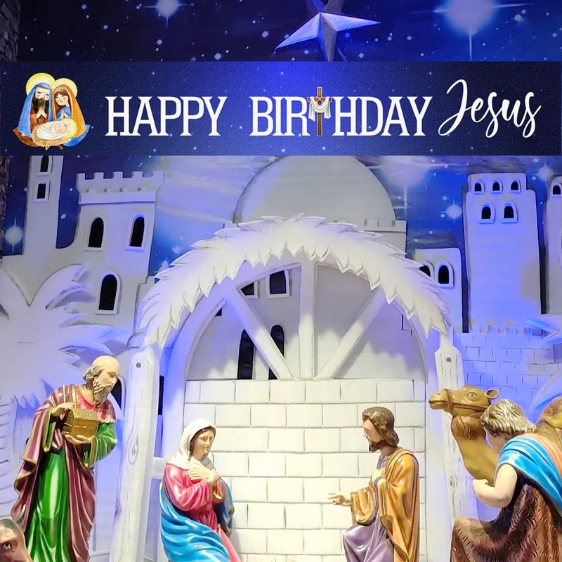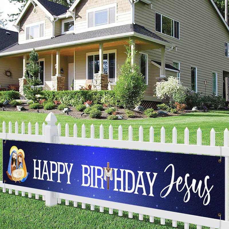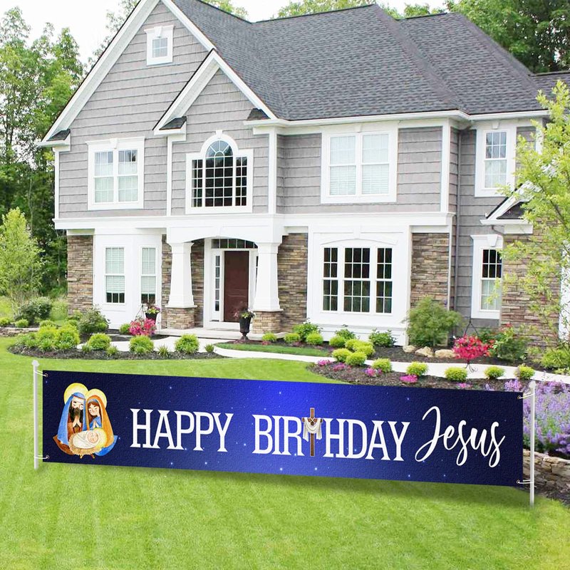 Happy Birthday Jesus Banner,Christmas Birthday Banner for Christmas Jesus’s Birthday Party Decorations,Yard Backdrop of Happy Bday Jesus God Party Decor (118” x 19.6”)