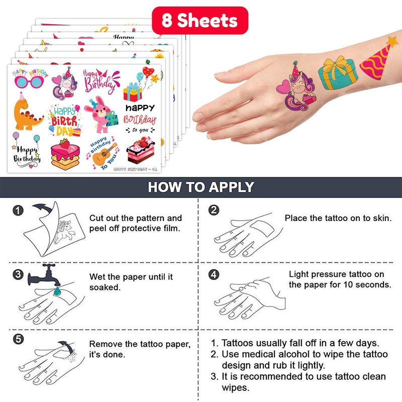 - 🎂【PERFECT TATTOOS FOR HAPPY BIRTHDAY CELEBRATIONS】: Happy Birthday Temporary Tattoo decals are available in a set of 8 sheets. These sheets showcase a total of 96 intricate and captivating designs inspired by birthday symbols, making this collection a must-have for enthusiasts of joyful celebrations. Measuring 6.1 * 3.1 inches each, these sheets are perfect for both kids and teens to display their birthday spirit on clothing, accessories, or as thoughtful presents for partygoers.
