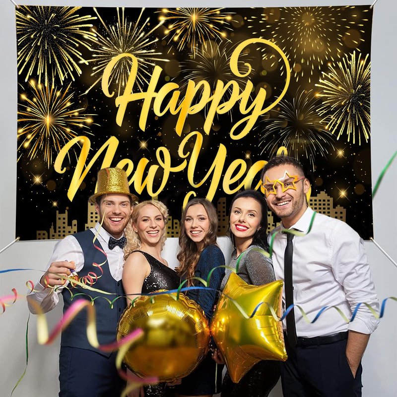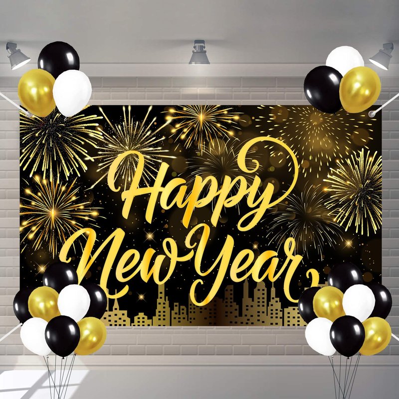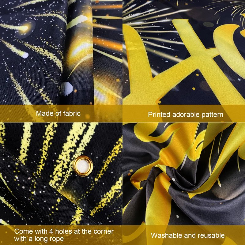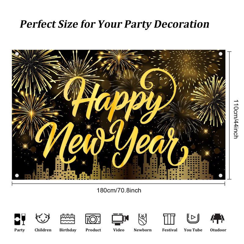 - Eye-catching Design: happy new year banner will be the best choice for your 2025 new year party. Simple and elegant design, with black as the base color, with oversized golden letters, and gorgeous golden fireworks blooming, this color matching is enough to attract attention.