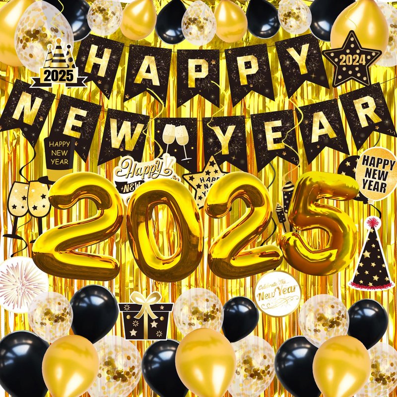 - What You Will Get:We have provided you happy New Year decorations 2025:1*Happy New Year Banner,1* "2025" balloon,2 *Foil Curtain,10*Black balloon,10*Golden balloon,10*Golden Confetti balloon,6*Black hanging swirls,6*Golden hanging swirls,and 2*set Hanging cards,10*Glue dots.