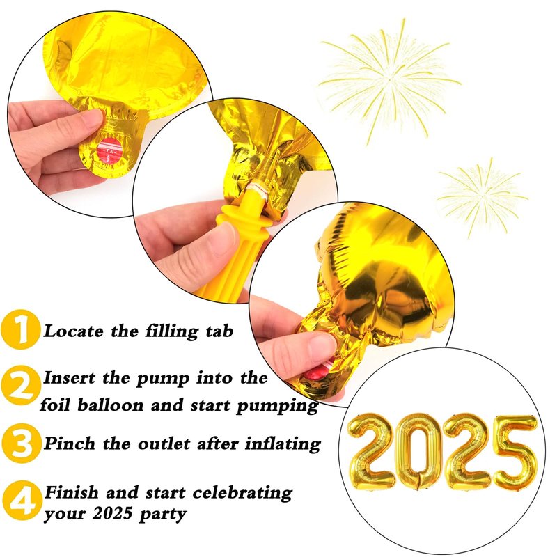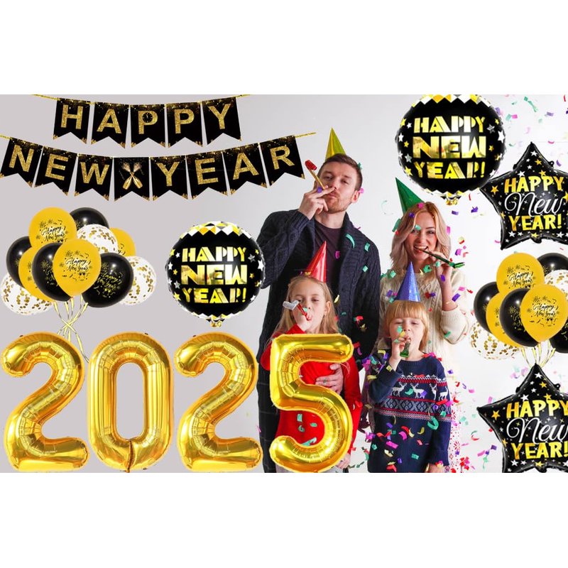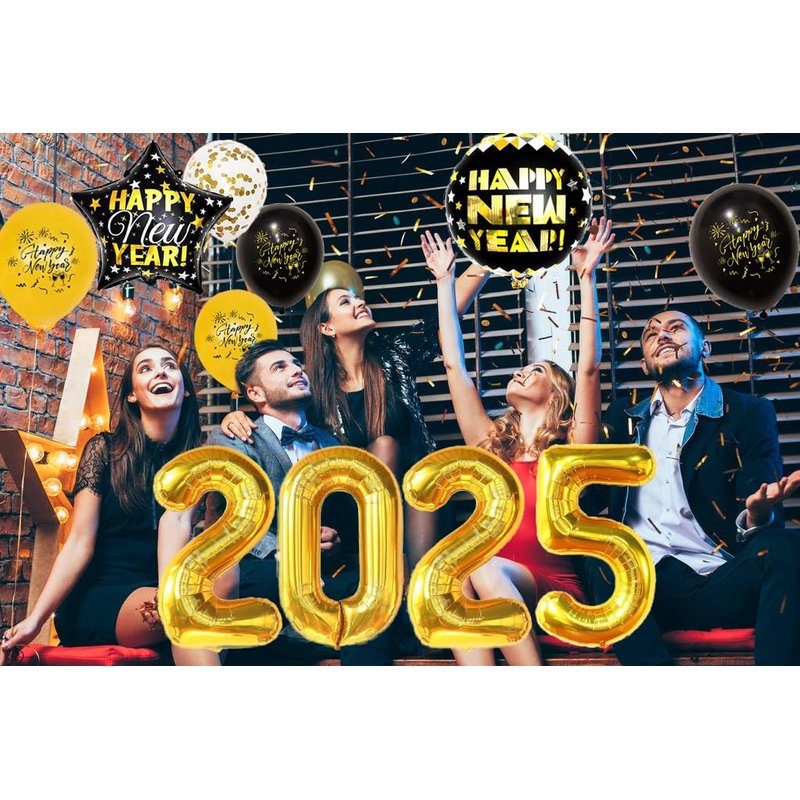 - Value Pack for New Years Eve Party Supplies 2025 : Package including 1 set “Happy New Year”banner, 32 inches 2025 gold foil balloons, 16 pcs 12-inch New Year's print latex balloons (8 pcs black and 8 pcs gold), 5 pcs golden sequins latex balloons, 4 x 18" New Year's pentagram foil balloons and 2 x 18" New Year's round foil balloons, so many in number and styles can meet the different needs of the New Year party