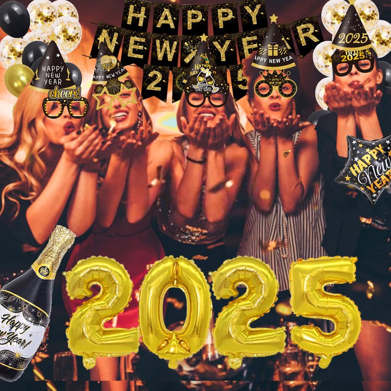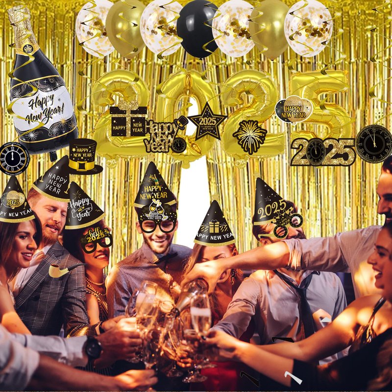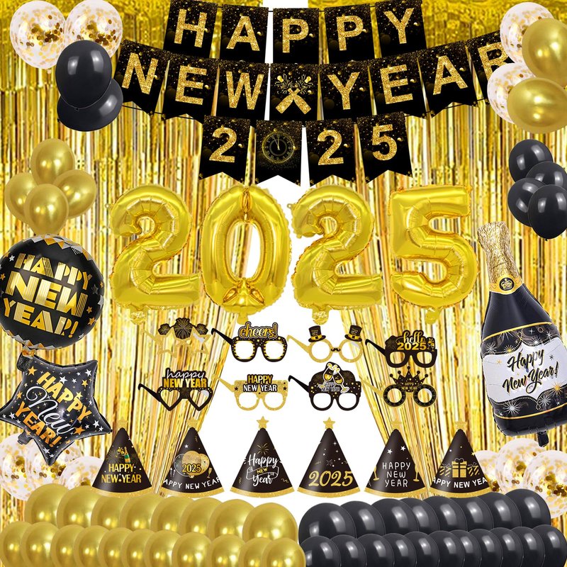 - 【2025 NYE Party Decorations】 This comprehensive New Year's Eve party decoration set includes everything you need to create a festive atmosphere, including New Year's hats, a banner, 30 12-inch balloons (10 golden, 10 black, 10 confetti), 1 New Year's 2025 balloon, 2 matte gold foil fringe curtains, 8 New Year's Eve glasses, and 3 foil balloons. It is an innovative and versatile decorative suite that will be the perfect choice for your New Year's Eve celebration.
