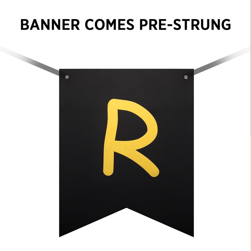 - 【Pre-strung Banner】The gold letters are printed on each 8 x 6.5 inches (L x H) black cardstock, and they are pre-assembled with black ribbon for easy hanging. Time saver EVER !