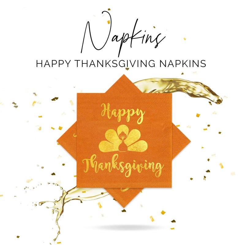 - GOLD FOIL STAMP- Each Napkin is a 3ply 5" X 5" and has a decorative "Happy Thanksgiving" with a Turkey Design and are great Turkey Dinnerware and Thanksgiving cocktail napkins!
