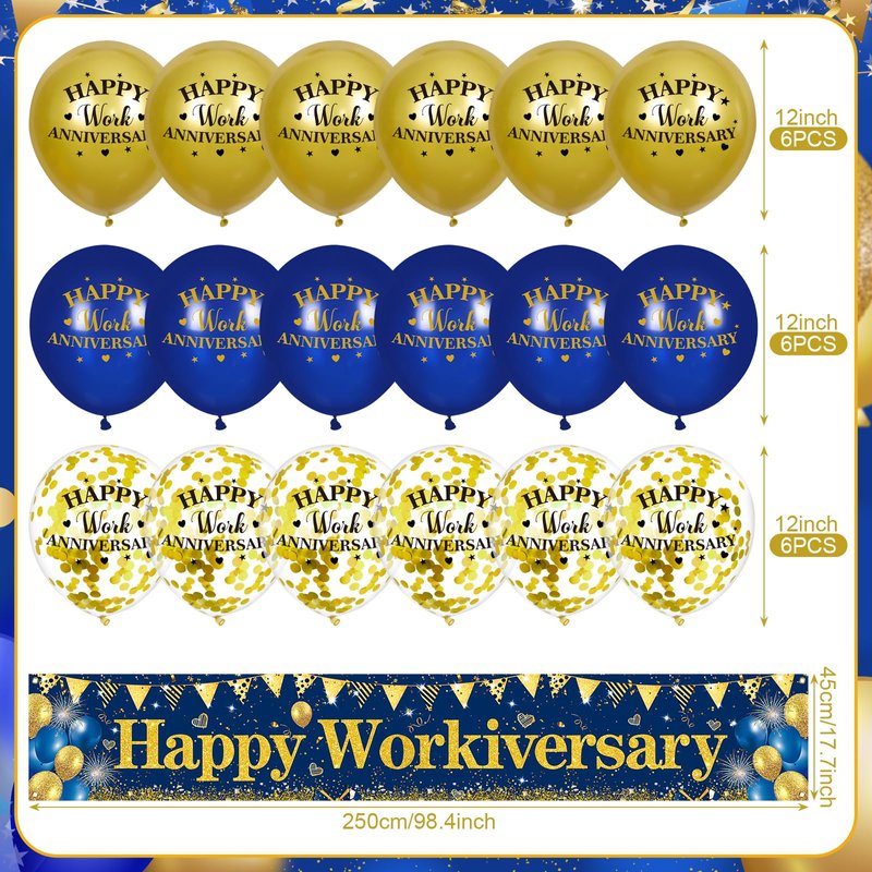 - 🎉Easy to Use: The Happy Work Anniversary banner comes with a long string and 4 copper buckles in the corners for your convenience, this blue gold Happy Work Anniversary balloons support air or helium. Notes: Please do not overfill the balloons and keep them away from heat or pointed object