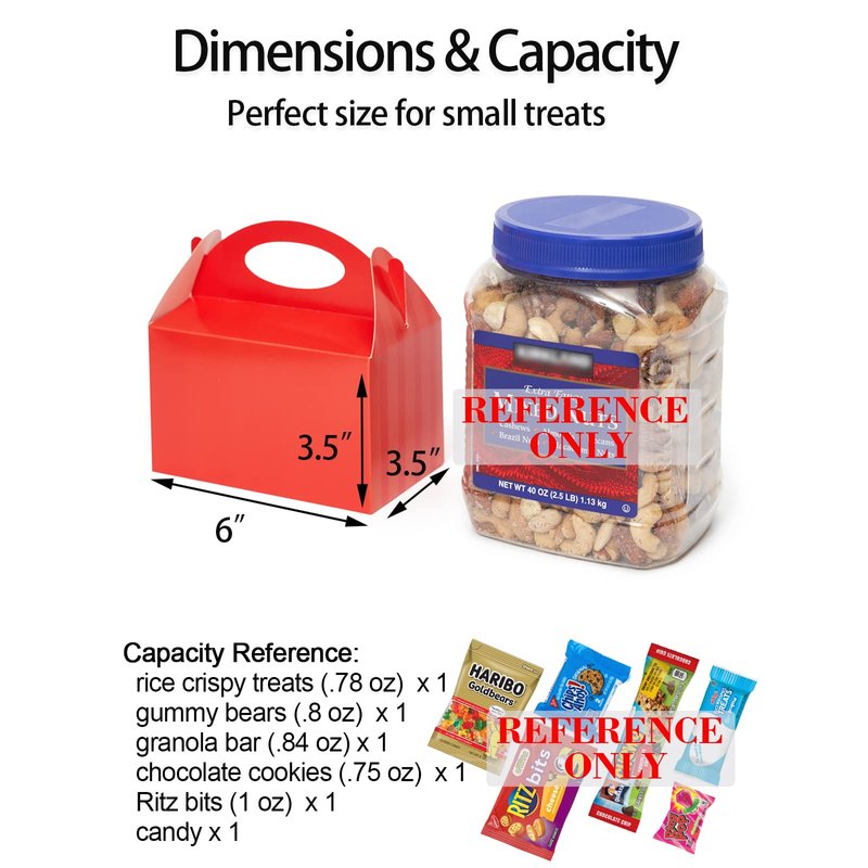 - Small Party favor boxes: Measurements of 6" L x 3.5" W x 3.5" D fit a variety of items, including popcorn, toys, party favors, cupcakes, muffins, coca bombs, cookies, macarons, sweets, and candles.