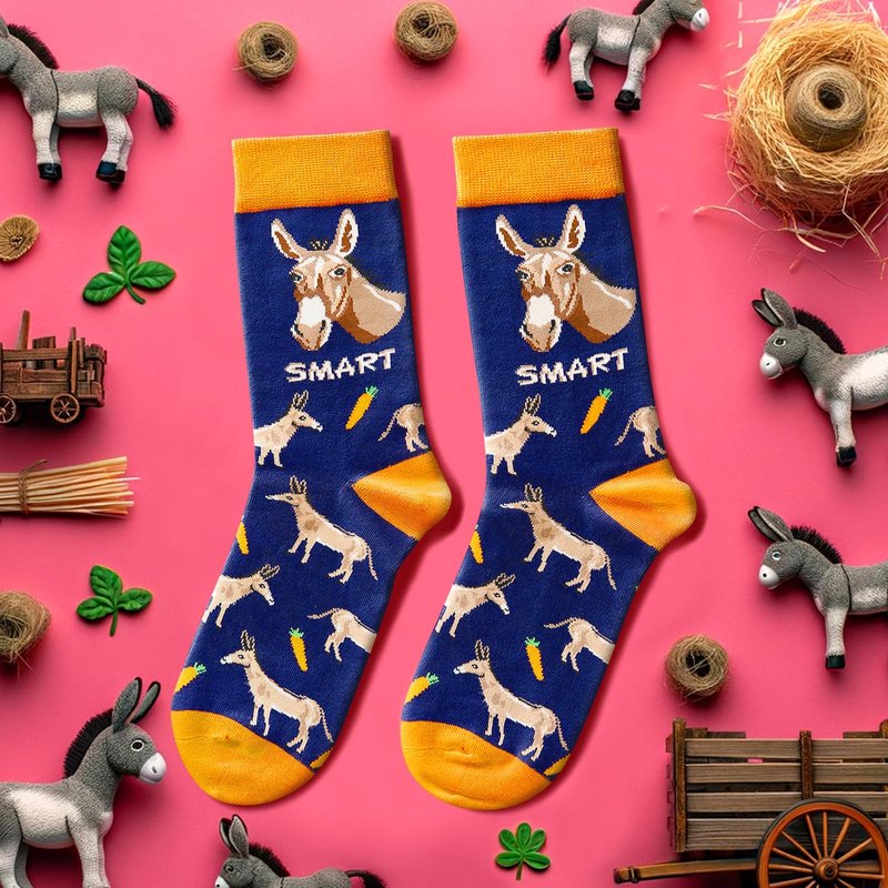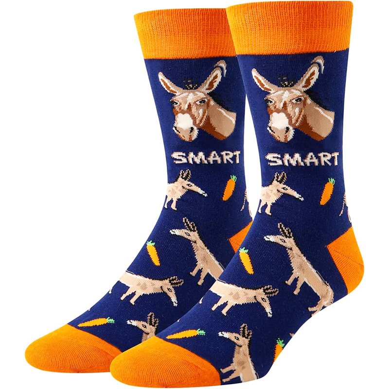 - DONKEY SOCKS: These dark blue socks with orange spirals are decorated with funny donkeys and their favorite carrots. Are the donkeys silly? Of course not! They are very clever. The smart donkey is watching you!