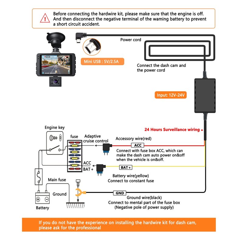 - 【24 Hours Parking Surveillance】The Mini USB vehicle hardwire kit connected to car battery or fuse box power, can uninterruptedly supply power for dash camera 24 hours parking surveillance. The dash cam switches to parking surveillance mode automatically when your turn off the car engine, and switches back to normal recording when on.