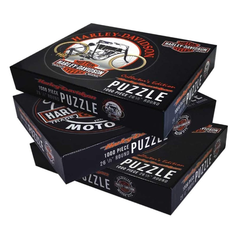 Harley-Davidson Motor Oil Round Puzzle, 6022D. This puzzle is fun for the whole family. Comes with 1000 jigsaw puzzle pieces. Finish puzzle size is 26.5" round. Puzzle image features a iconic Genuine Motor Oil Bar & Shield logo.