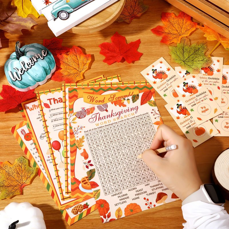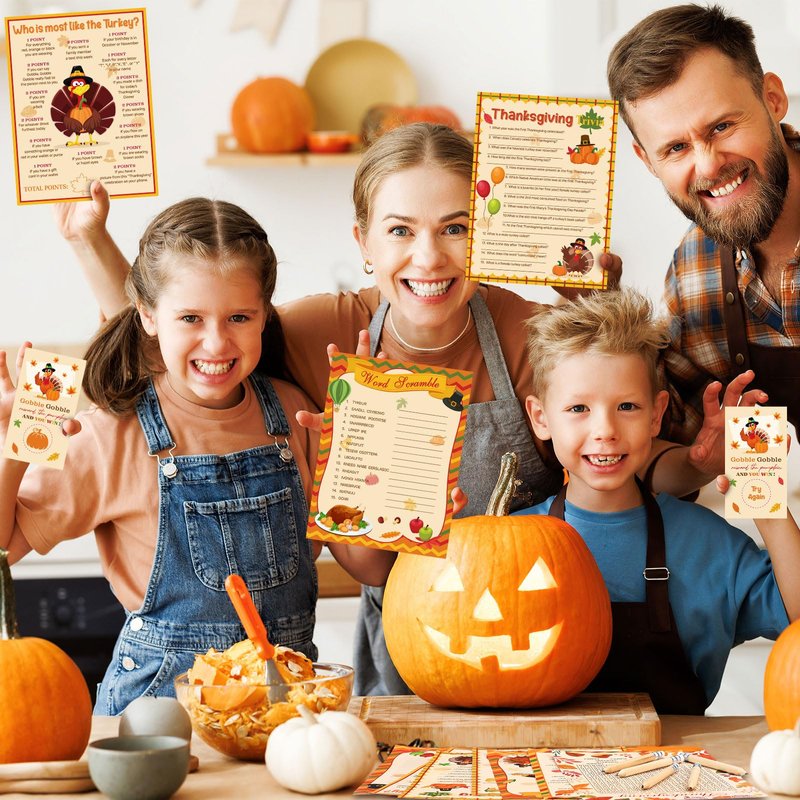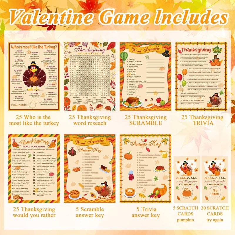 - 5 Different Thanksgiving Games: the Thanksgiving family games come with Thanksgiving trivia game, Thanksgiving word search, who is most like a turkey game, Thanksgiving word scramble game, turkey game (these 5 games have 25 question cards each, 2 of the games have 5 answer keys each), these Thanksgiving games are fun for your friends and family members to play together