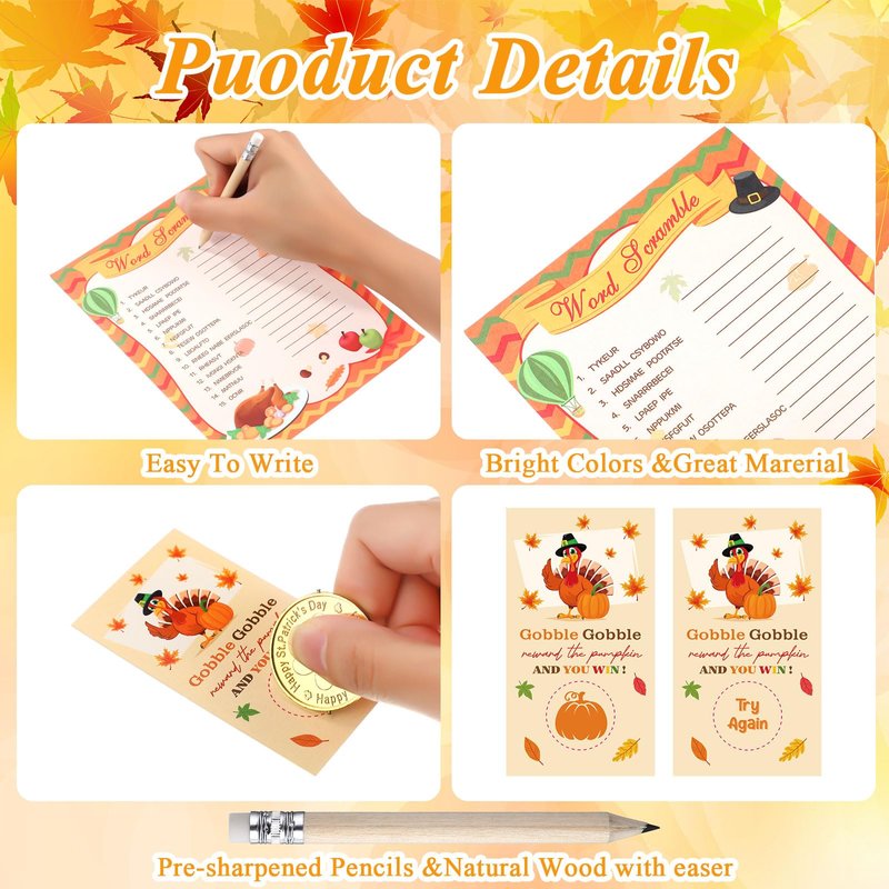 - Fall Party Games Sets: there are a set of Thanksgiving games which is 172 pieces in total; 160 sheets of game cards for Thanksgiving party including 5 different games (answers including) and 12 pieces of Thanksgiving writing tools to write answers, suitable for Thanksgiving party, fall party, autumn activities and more