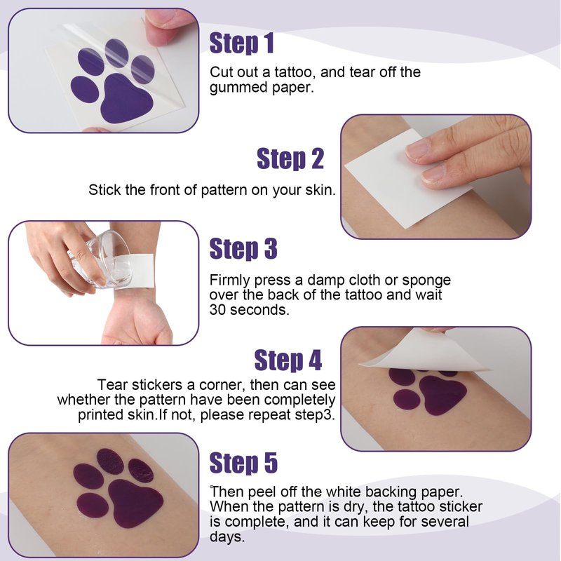 - Easy to Apply: don't worry if you've never applied temporary tattoos before, our paw print tattoos are easy to use, you need to first cut out the purple claw print tattoo pattern, tear off the surface film, then wet it with water, press for about 20 seconds, and finally gently tear off to obtain the purple claw print tattoo, keep the tattoo away from water for 2 hours to extend its lifespan