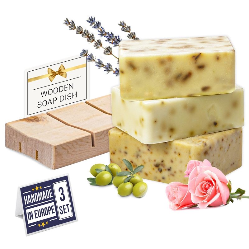 HARMONIFY All Natural Set of Soap Bars, Rose, Lavender, Olive Oil with Wooden Soap Dish, Assortment of Natural Hand-Made Soaps, Made in Europe