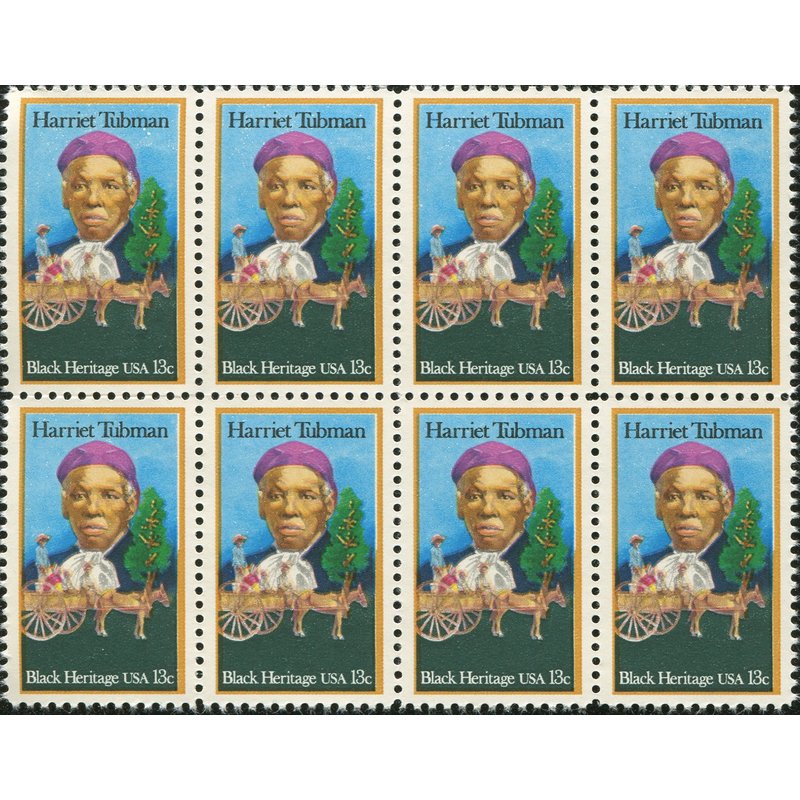 THIS IS A BLOCK OF 8 STAMPS AS PICTURED. ~ On February 1, 1978 in Washington, DC., the USPS issued the first stamp of the Black Heritage Series, honoring Harriet Tubman, known as the Moses of her people. A former slave, she escaped bondage by fleeing to Pennsylvania. However, she returned to the South at least 19 times in order to help more than 300 slaves escape to freedom.