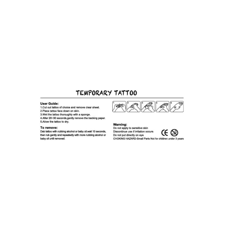 - Safe & Temporary: These tattoos last as long as you need them to but come off easily when it’s time for a fresh start. Use a little baby oil or rubbing alcohol and say goodbye.