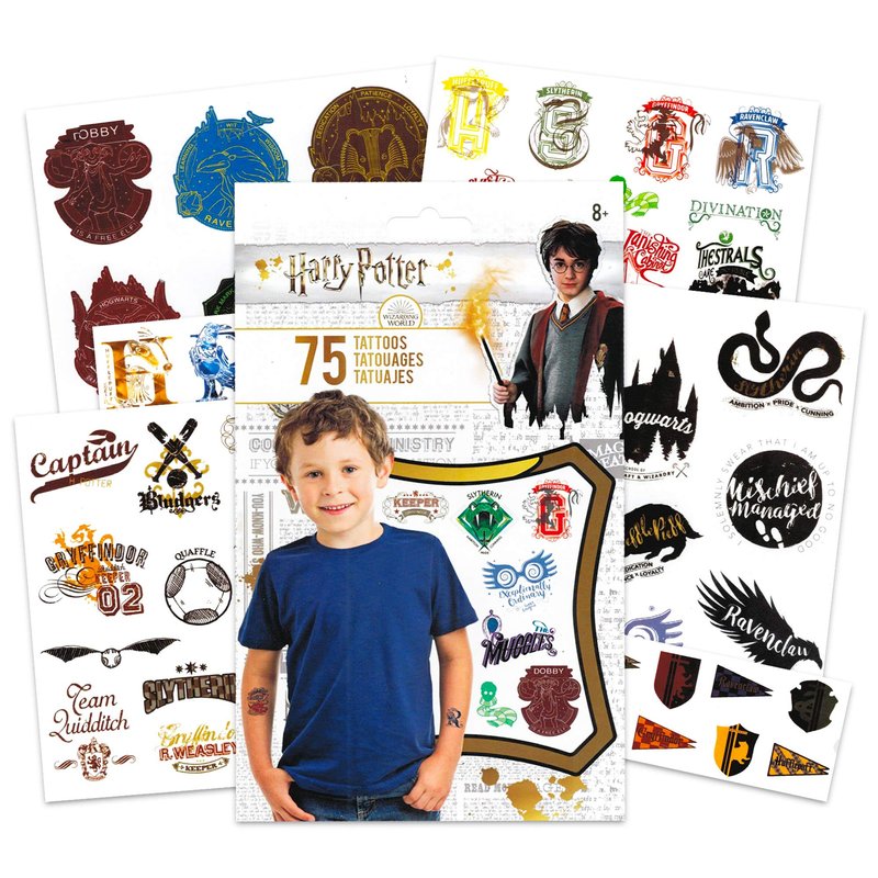 - Includes 75 Harry Potter temporary tattoos -- 5 tattoo sheets featuring the four Hogwarts Houses, Quidditch, and more. Harry Potter temporary tattoos are fun, fast to apply, easy to remove. FD&C Approved Ingredients. The perfect Harry Potter party activity.