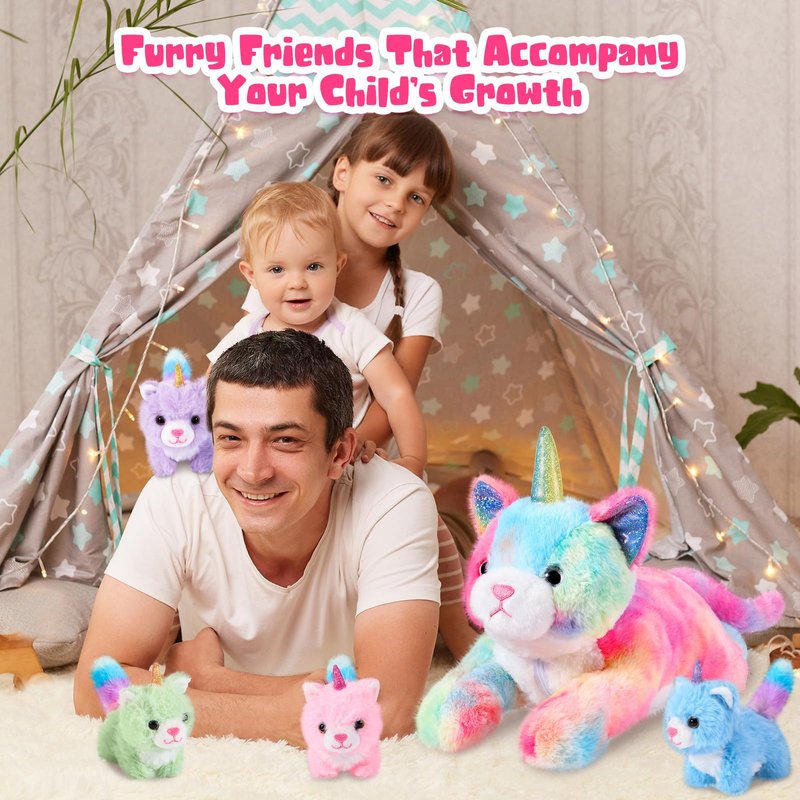 - Colorful Rainbow Caticorn Toy Set: the mommy cat unicorn measures approx. 16 inches/ 40 cm, and the 4 baby kittens of different colors are about 4.72 inches/ 12 cm, cute and vibrant, easily attract others' attention