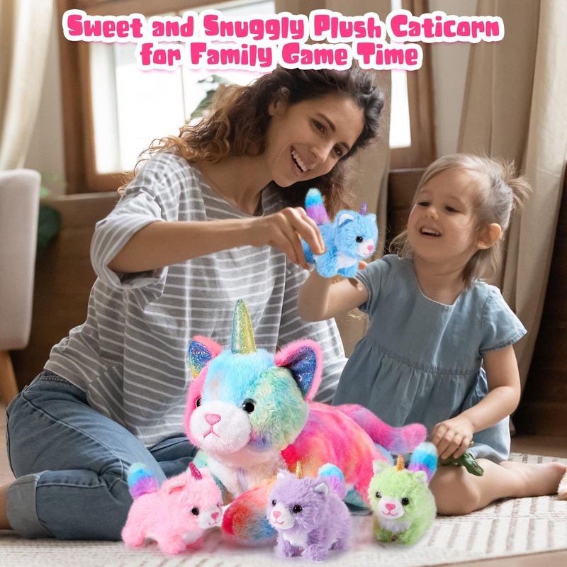 Harrycle 5 Pieces Caticorn Plush Toy Set 16 Inch Mommy Cat Unicorn Stuffed Animal with 4 Cute Plush Baby Kittens for Boys Girls Rainbow Caticorn Plush Set for Birthday Gifts Party Favors