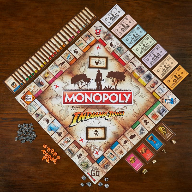 - INSPIRED BY THE INDIANA JONES MOVIES: This Monopoly: Indiana Jones Edition board game celebrates Indy with artwork, game pieces, locations, and themes inspired by the original Indiana Jones trilogy