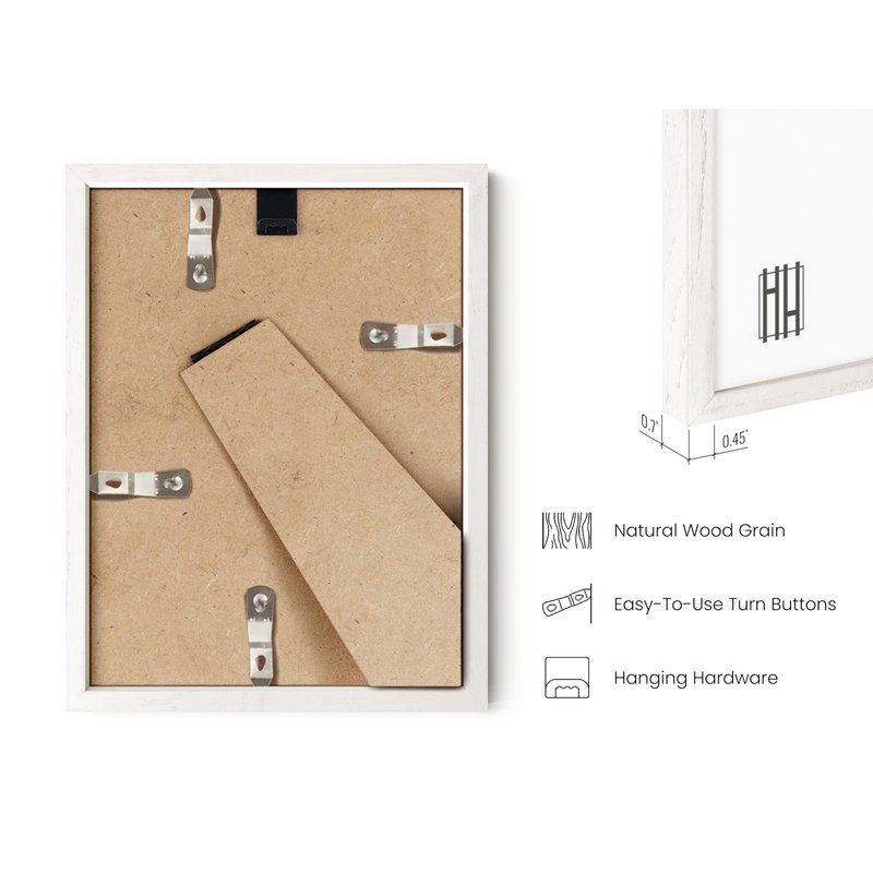 - PREMIUM WALL ART: Our white photo frames will add the finishing touch to your art or photograph. They're equipped with plexiglass covered by protective film and a metal hanger for vertical hanging. For added convenience, our picture frames are shipped in a durable box, securing their protection throughout transit