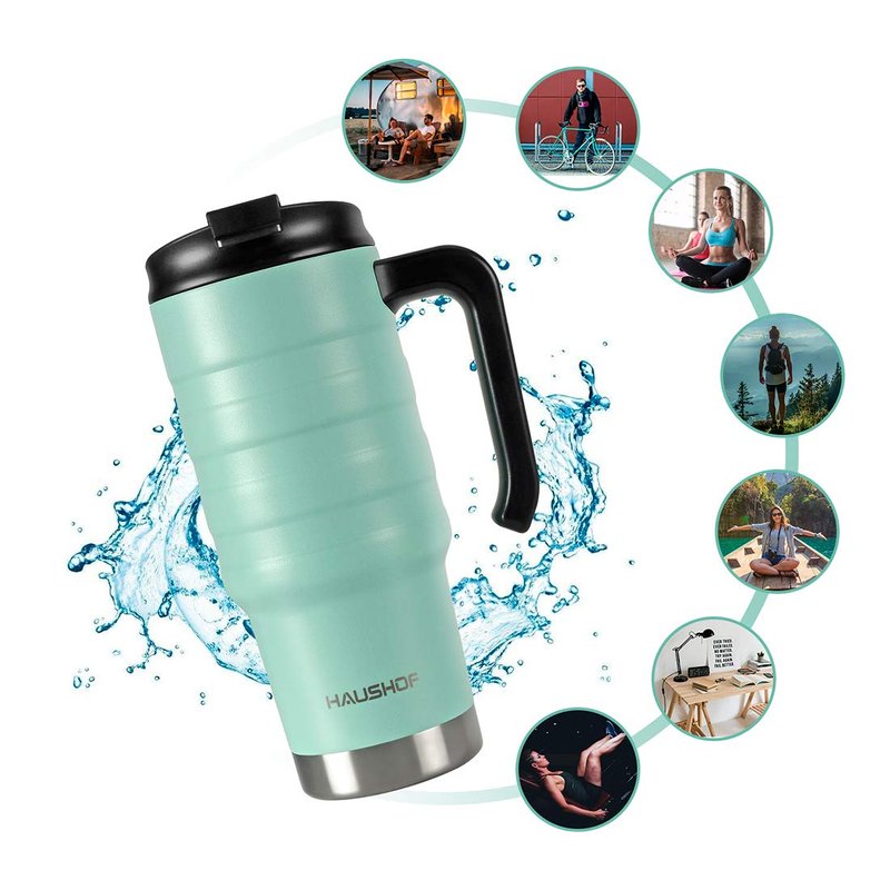 HAUSHOF 24 oz Travel Mug, Stainless Double Wall Vacuum Insulated Tumbler with Handle & Spill Proof Twist On Flip Lid and Wide Mouth, BPA Free