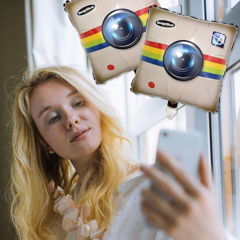 - PLUS BALLOONS GALORE(9 Total)! – 3, 18" Mylar foil Balloons. 2, Black Square Balloons with “@” on one side and “#”, Hashtag on the other. 1, Square Camera, printed on both sides. And a 6 Pack of multi-colored and logoed 12” Latex Balloons. These feature social media logos on both sides of each balloon!
