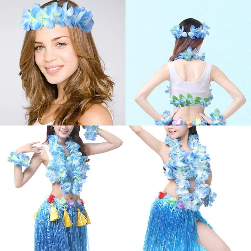 - 【HIGH QUALITY】 Excellent handmade soft materials and exquisite workmanship, hand-crafted carefully down to every detail to give a stunning, magical, sexy, lovely chic look. It is made of high quality eco-friendly smooth shiny plastic, package: 2 pack headband + 2 pack leis necklace + 4 pack braceklets, approximately circumference for necklace is 41.3", for headband is 16.5", for bracelet is 7.9". What are you still waiting for? just add it to your cart and enjoy it with your friends and family