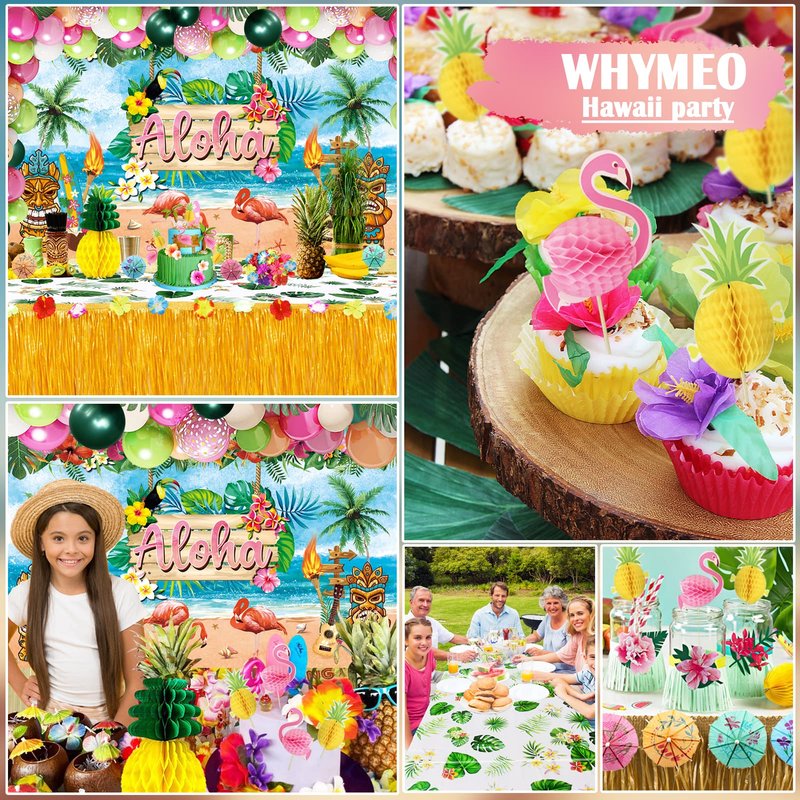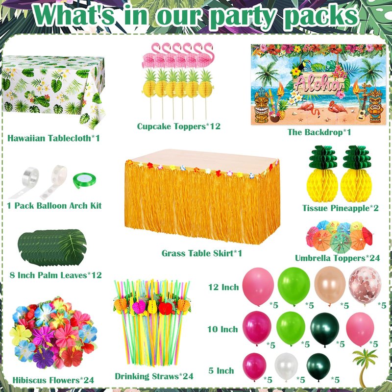 - Complete Set of Hawaiian Luau Party Decor -- You will get 1 new designed Hawaiian backdrop, 1 x 9 feet long faux straw-colored grass table skirt, 1 Hawaiian plastic tablecloth, 24 cocktail drinking straws with 3D decor, 24 umbrella food toppers, 2 pineapple honeycomb, 12 palm leaves, 24 artificial hibiscus flowers, 6 flamingo and 6 pineapple cupcake toppers, 2 coconut palm tree foil balloons, 55 colorful latex balloons.(Dots, ribbon, balloon chain, etc, are included)