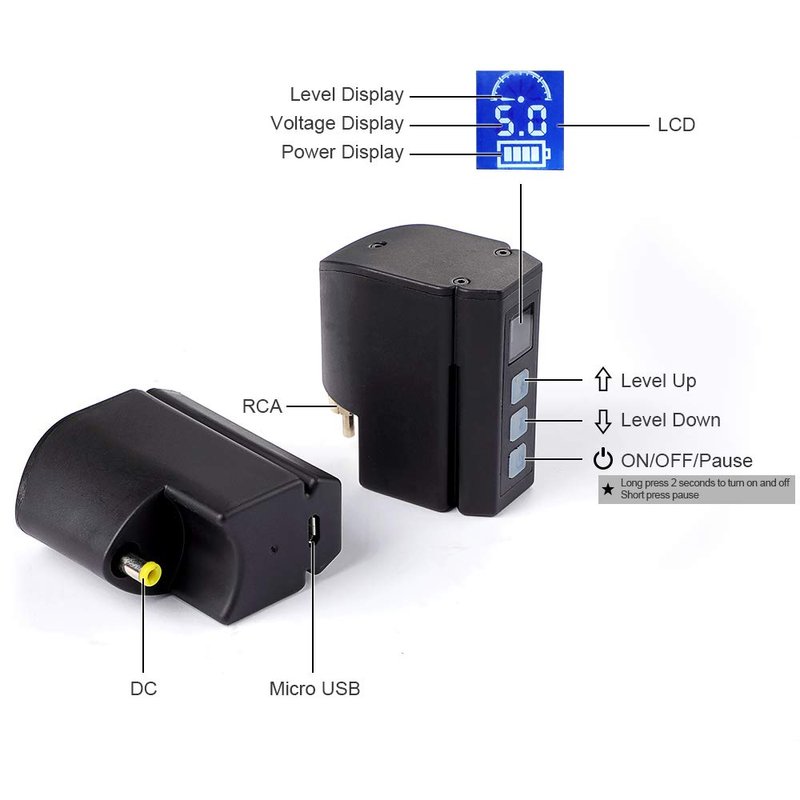 - It has a capacity of 2400mAH, Fully charged, Run 4.5 to 11 volts.Lithium battery lasts 5-8 hours depending on your voltage and motor.. It comes with a 13 level voltage control from 5V-11V. If you have 2 pcs power packs, you can tattoo for a whole day session! Charge one battery pack while you tattoo with the other! "