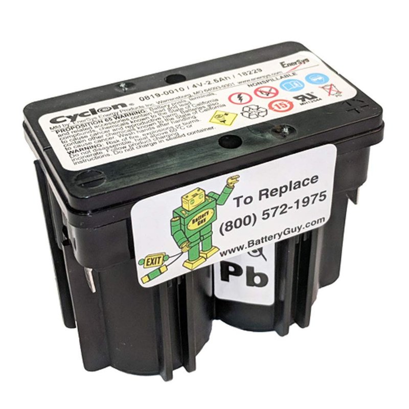This is a Hawker/Cyclon/Enersys 0819-0010 battery widely used in emergency lights. The Hawker/Cyclon/Enersys 0819-0010 4 volt 2.5 Ah Pure Lead battery is a popular replacement battery in many emergency lighting units --- BatteryGuy Supplies Enersys Cyclon, the most reliable Pure Lead Acid Battery in the Industry. Enersys Cyclon has Been Around Since its Inseption in 1973 and has Been Through Several Different Name Changes Since Then. Enersys Cyclon Was Known as Gates Battery and Hawker Battery in the Not so Distant Past. Enersys Cyclon Pure Lead Batteries are Known for their Superior Deep Discharge, Maintaining their Performance in Extreme Conditions, Long Service Life, Rugged Construction as Well as their High Rate Charge and Discharge. The Enersys Cyclon Battery Offers the Greatest High-Rate Power Density for Your Energy Dollar. Chemistry: Pure Lead Acid Dimension: 3.13" L x 1.81" W x 2.75" H Configuration: 2 Cell Monobloc Housing Type: Monobloc Connector Type: 0.187" F1 Faston Tabs