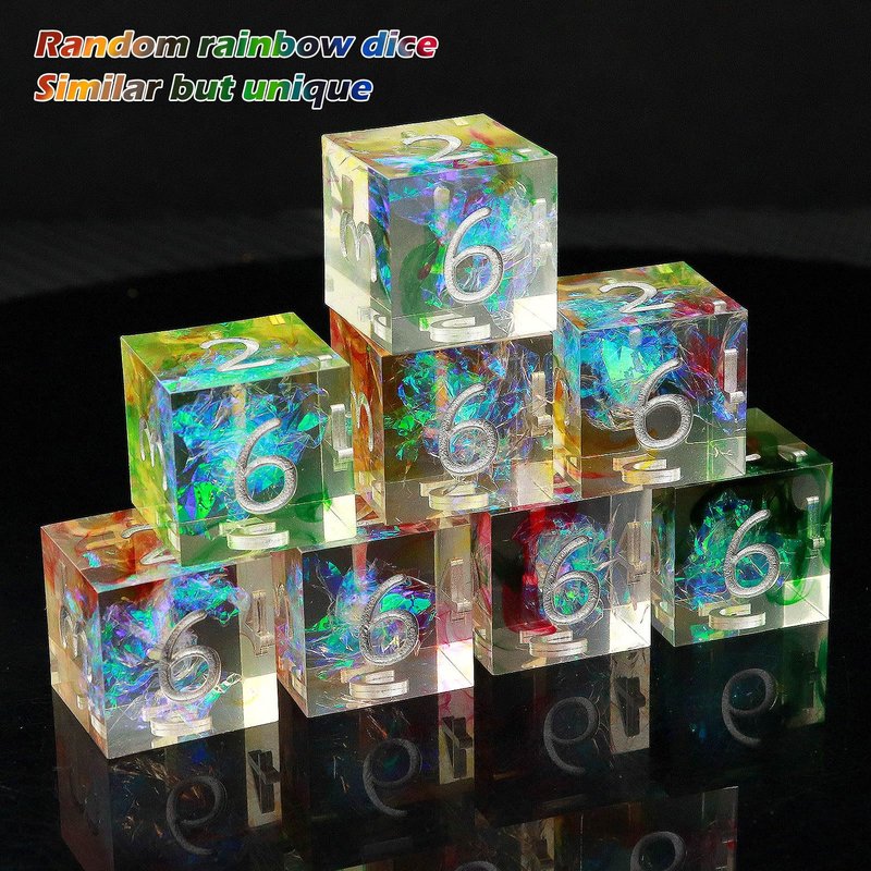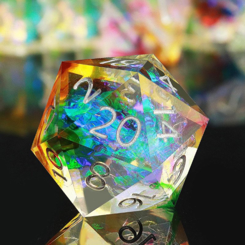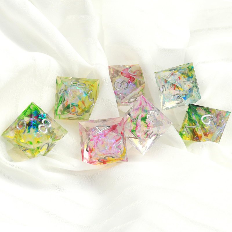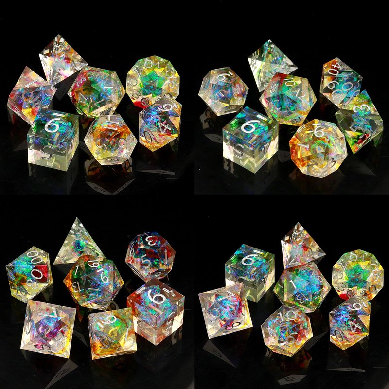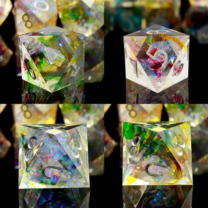 Upgrade your D&D and RPG gameplay with our Iridescent Sharp Edge Dice Set with colorful floating cloud effect.
