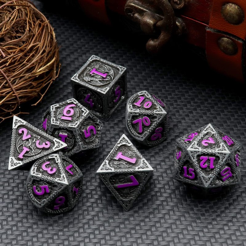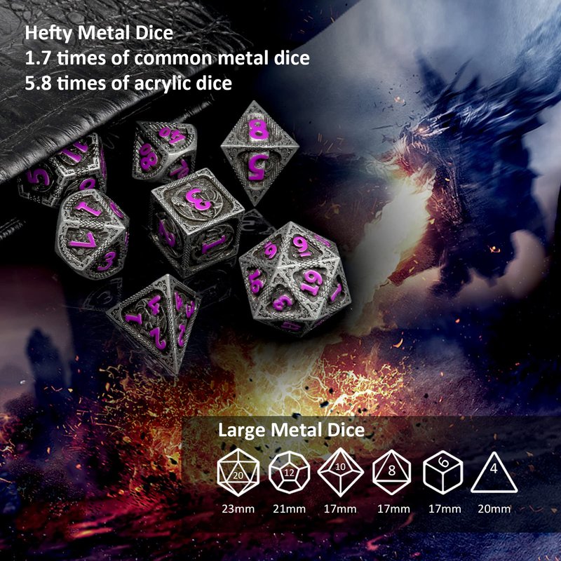 Haxtec Metal DND Dice Set Black Purple Dragon Pattern D&D Dice Set with Leather Dice Bag Metal Polyhedral Dice for Dungeons and Dragons TTRPG Gifts