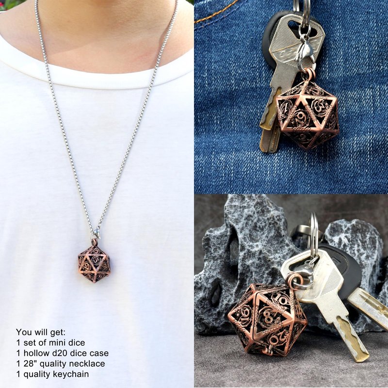 • Hefty Metal Dice Set: The dice are made with solid zinc alloy for use of years. Hollow cage is made of brass. Necklace and keychain are made with 304 stainless steel.
